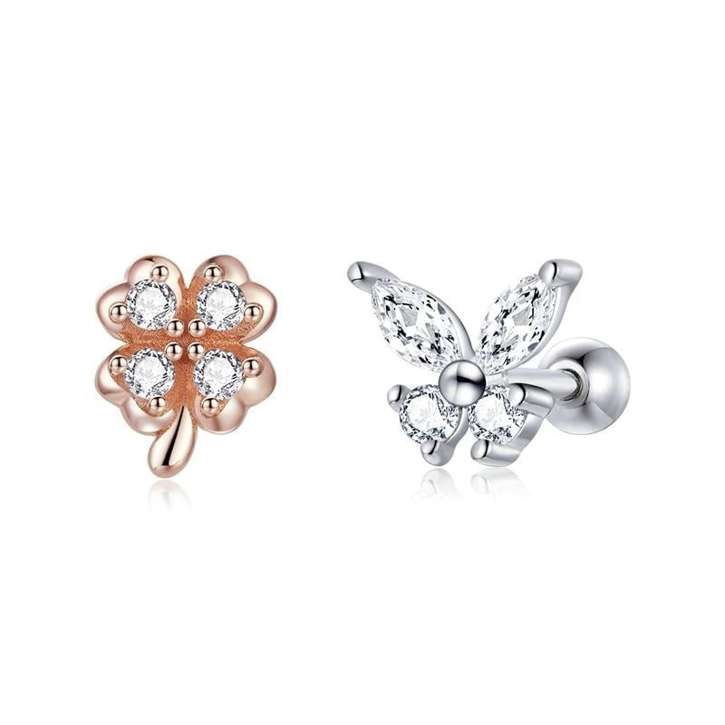 Design: Asymmetrische Ohrstecker mit Blumen- und Schmetterlingsmotiv aus Kristall