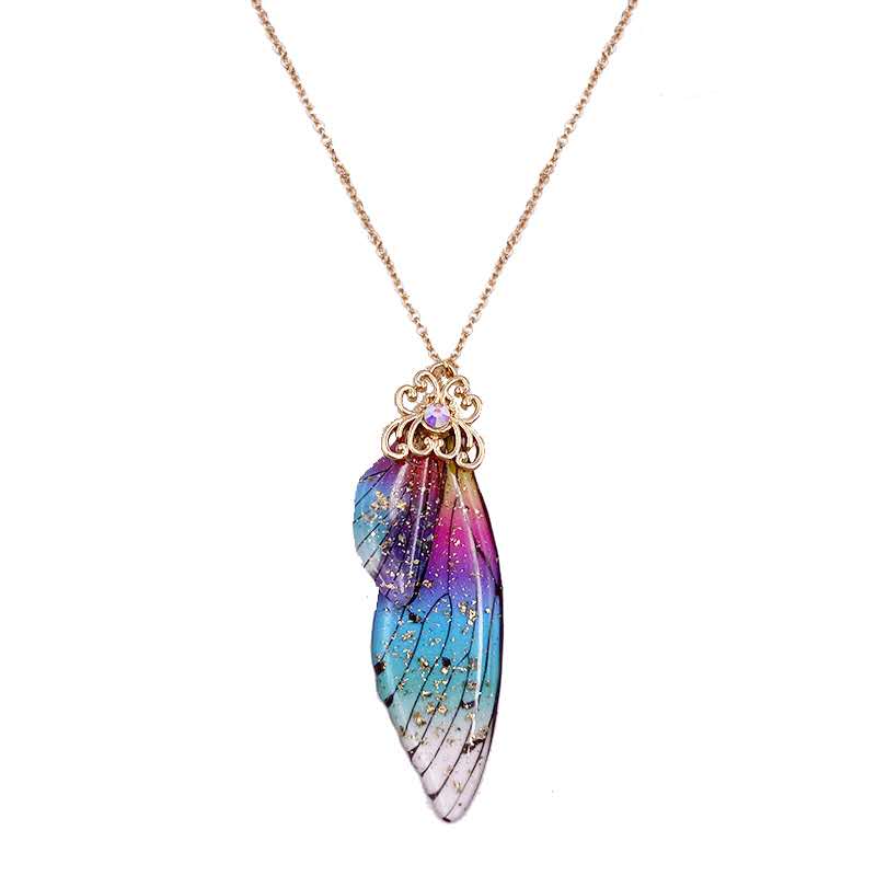 Design: Handgefertigter Anhänger mit Flügeln aus Kristallfee-Schmetterling und Folienflocken an einer Halskette
