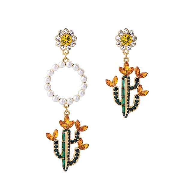 Design: Kristallkaktuspflanze und Blumen auf einem asymmetrischen Creolen-Statement-Ohrring