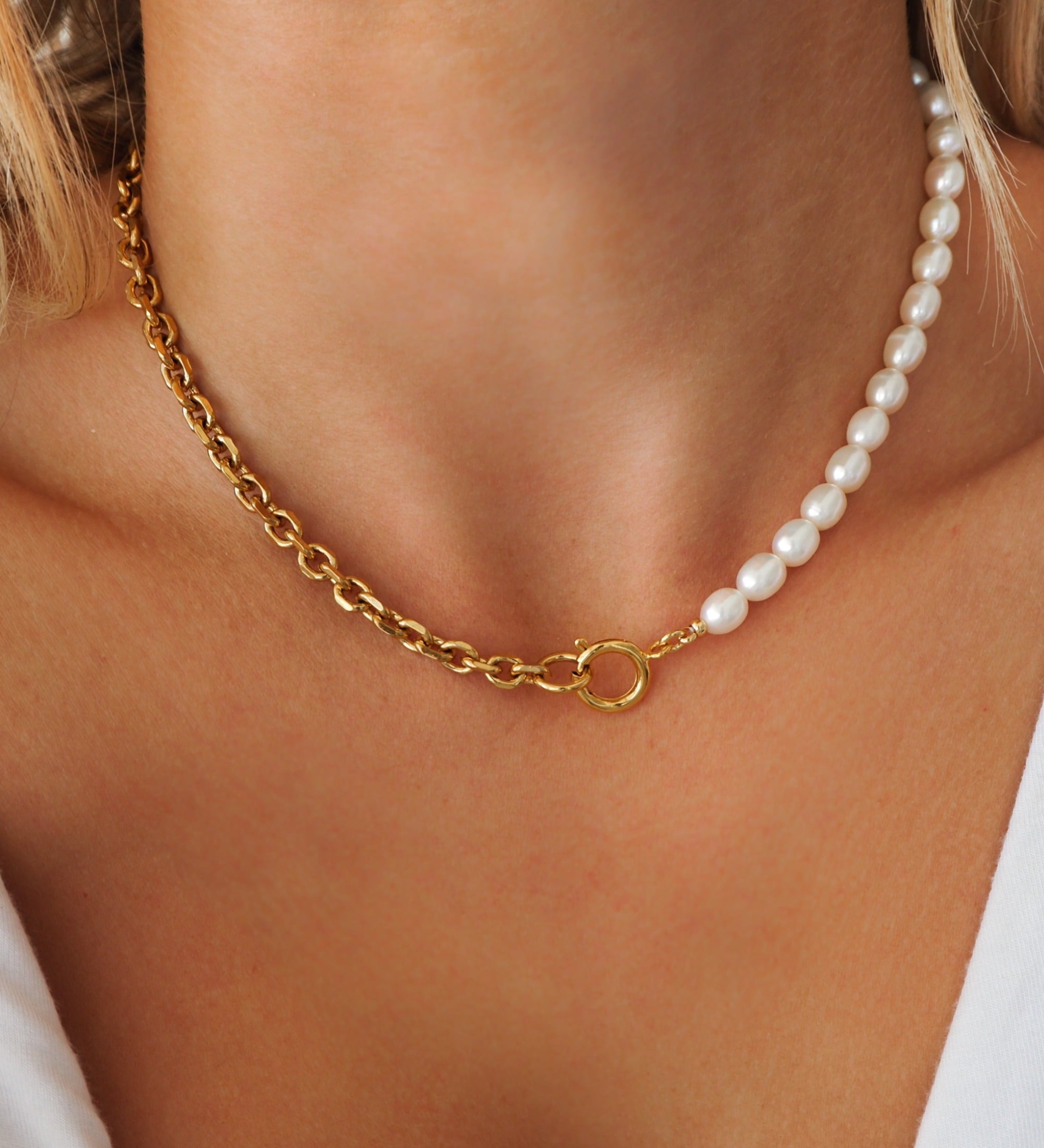 White Freshwater Pearl Half Chain with Gold Link Chain Clasp Necklace