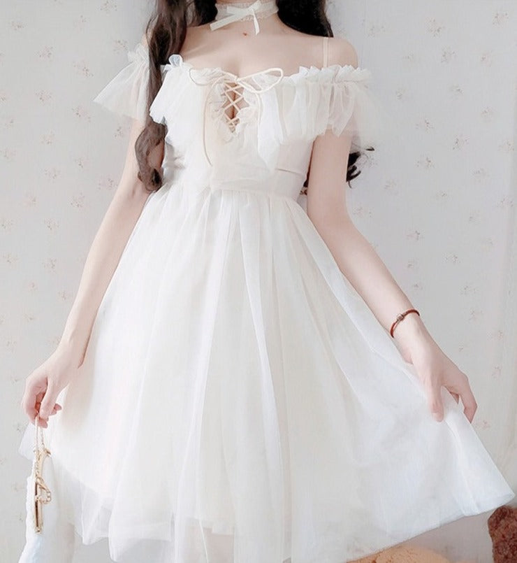 Transform into a magical fairy princess with our Lace-Up Fairy Princess Dress 🧚♀ï¸? The off-the-shoulder design and front lace-up detail add a touch of enchantment. while the ruffle sleeves and mesh overlay create a fairytale-inspired look. This unique and pretty dress will make you feel like you're living in your own fairy tale! âœ?/p>