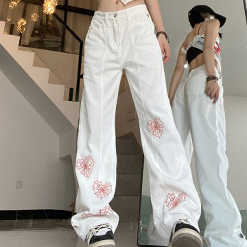 Take a bold fashion risk with our Love Web Jeans! These edgy jeans feature a striking red heart-shaped spider web print that will set you apart from the crowd. The wide leg and unique design are perfect for the adventurous and alternative fashion lover. 🕸ï¸?/span>