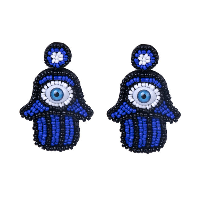 Design: Beaded Hand. Hamsa. Lucky Eye Drop Statement Earrings