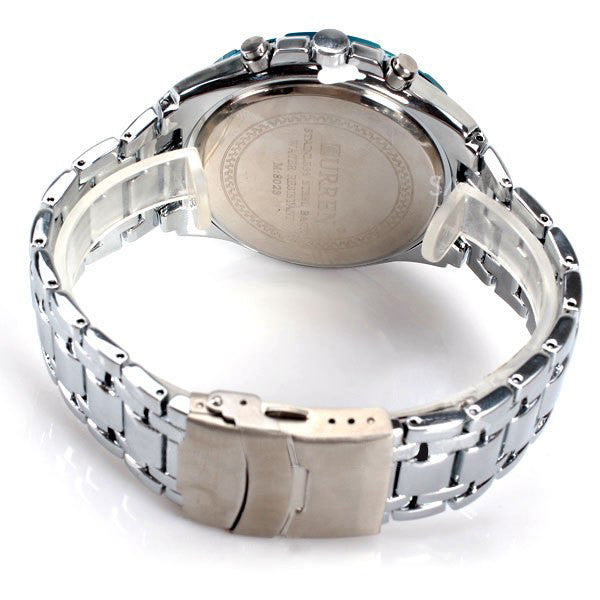 The Quartz Chronograph is a rendition of style that combines the lustrous tones of black and silver with a vibrant array of aqua accents. Its sturdy stainless steel construction ensures durability and stylish ruggedness that can be worn anywhere. The chronometer dial brings attention to the fact that this time piece is one of the highest technology and style. No matter what the occasion is. this watch is sure to make headlines.