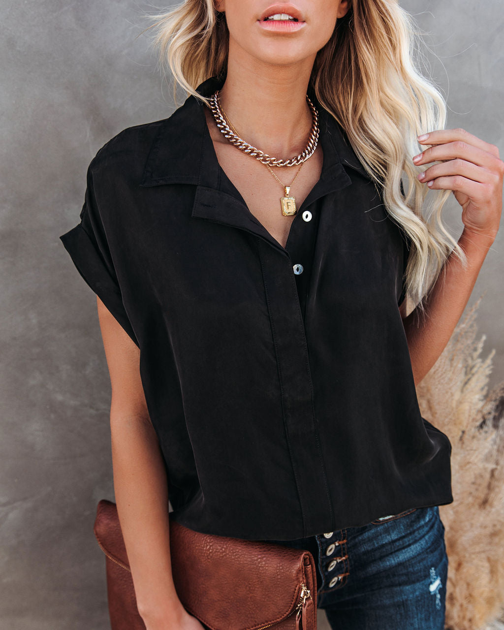 Our Alexa Collared Button Down Top is so polished! This black collared top has sewn cuffed short sleeves with front button closures and a rounded hem. Wear it with any refined denim. Styled with the Mica Chain Choker. Initial Card Necklace. Stella Crossbody Envelope Zip Clutch. Tilley Frayed Ankle High Waisted Skinny. and Samira Heeled Faux Leather Bootie.